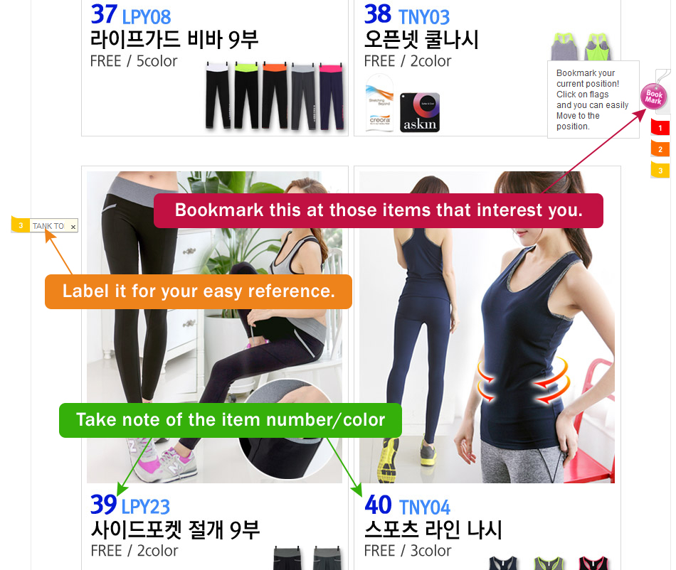 Since some shops list their similar items all in one page, when you are interested in a particular product, just click on to the rounded bookmark icon, then a small color tag labels “1” will show up, you can write a short name for easy reference later. In the picture above, I have marked 3 bookmarks and have named the 3rd one to “TANK TOP”