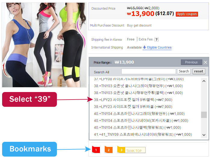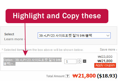 If you know Korean language, you can skip this section. Click “Select” to choose item from the drop down list. In this example I have chosen item 39, there are 2 colors option, simply select the first one.