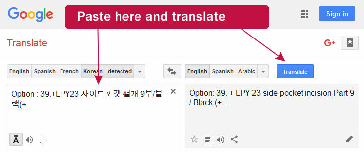 Highlight and copy the entire option and head down to Google translate (you can use Google Chrome translate feature if you like), paste in the box as shown in below, you will see the translation on the right. Repeat for the other option if this color is not what you wanted to purchase.